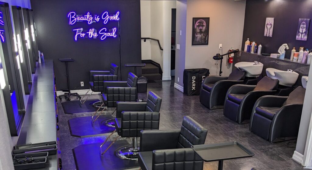 There are fresh renovations that were done to make the vibe feel like a lounge. We serve mimosas to our clients and love to cater to client's hair needs. There are three wash bowls, 7 stations, a classroom, a large entry space and waiting area and music is always playing.